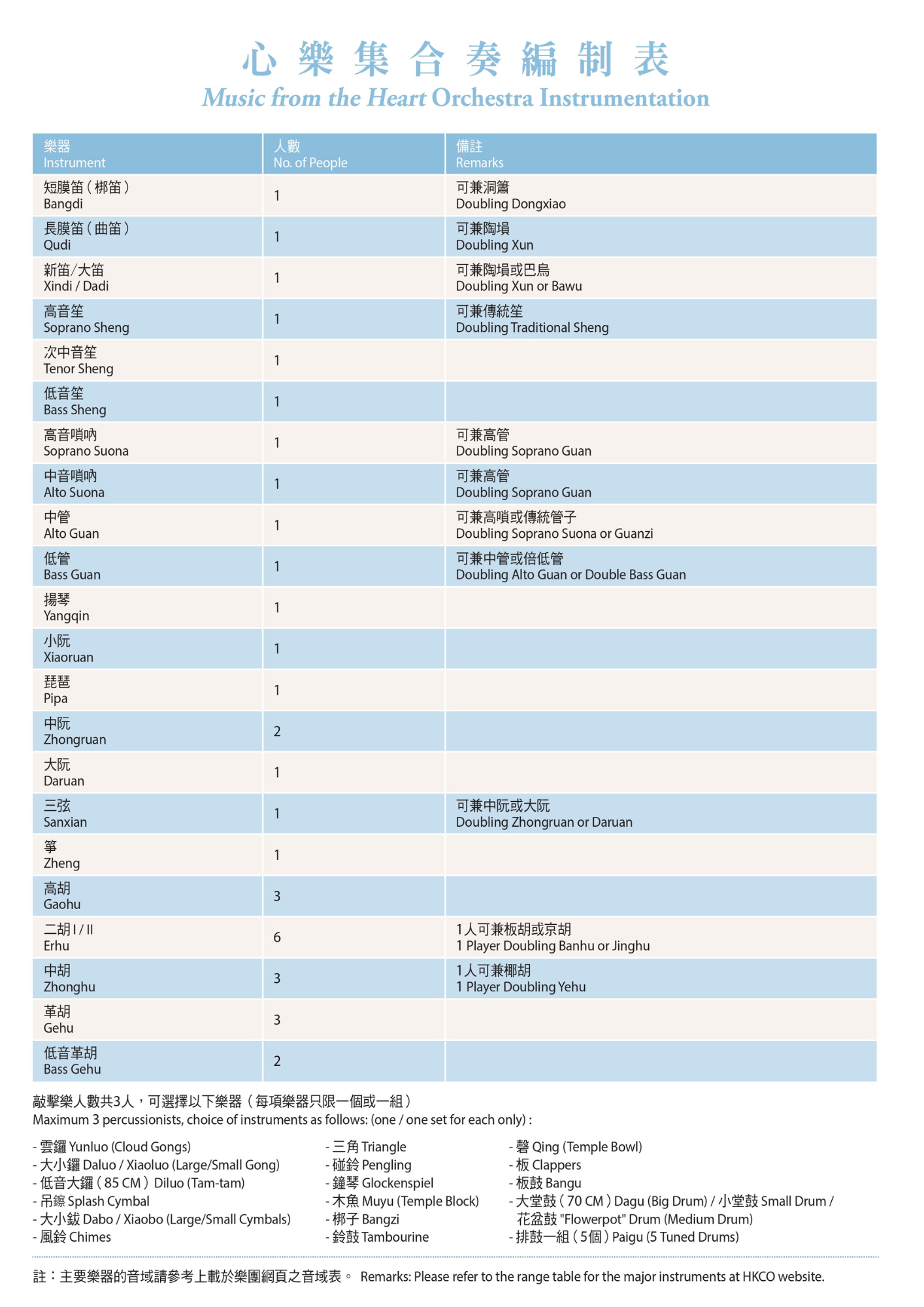 (38人編制,請參閱附表;樂團一般樂器音域表請瀏覽樂團網站常規樂器音域表及總譜格式